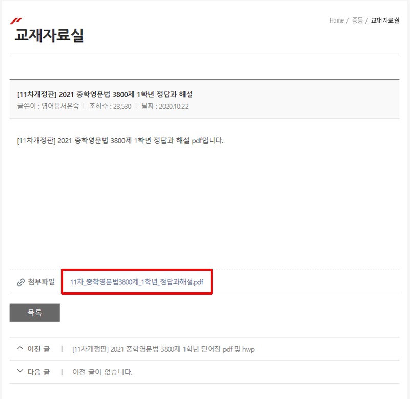 해당 시리즈를 선택하면 위와 같이 게시판에 이와 관련된 교재 자료들만 쭉 나오게 되는데요. 이곳에서 정답과해설이라고 분류되어있는 부분들로 들어가서 받아주시면 중학영문법 3800제 1학년 답지를 받아볼 수 있습니다.