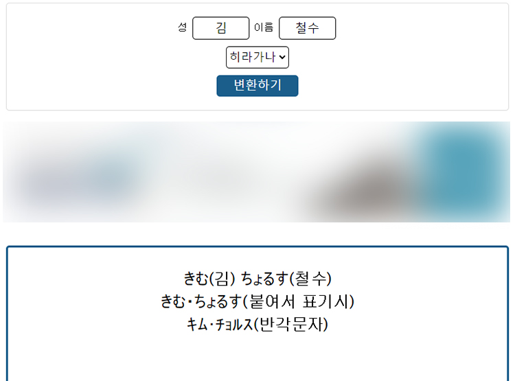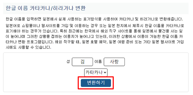 이곳에서는 말 그대로 한글 이름을 일본어로 변환해주는 기능을 가지고 있습니다. 일본 쇼핑몰이나 사이트 등에 가입할 때 표기해야할 일이 있을수도 있기 때문에죠. 여기에 자신이 알아보고자하는 이름을 입력하고 먼저 카타카나로 바꿔보겠습니다.