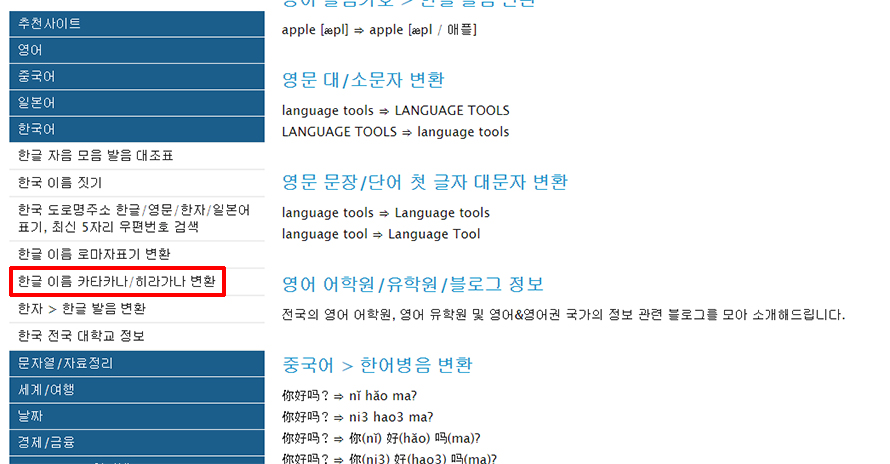 눌러보면 메뉴가 확장되면서 몇가지 항목들이 나오는데요. 이곳에서 선택할 수 있는 것들 중 한글 이름 카타카나/히라가나 변환이라는 것을 클릭하여 들어가주세요.